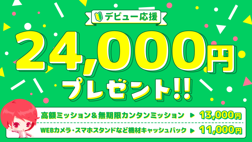 この期間中にガッツリ稼いで頂きたい!という思いから、期間限定で2万4千円がもらえる超お得なボーナスキャンペーンを開催中!今しかない大チャンスです!ぜひコンプリートしてくださいね!